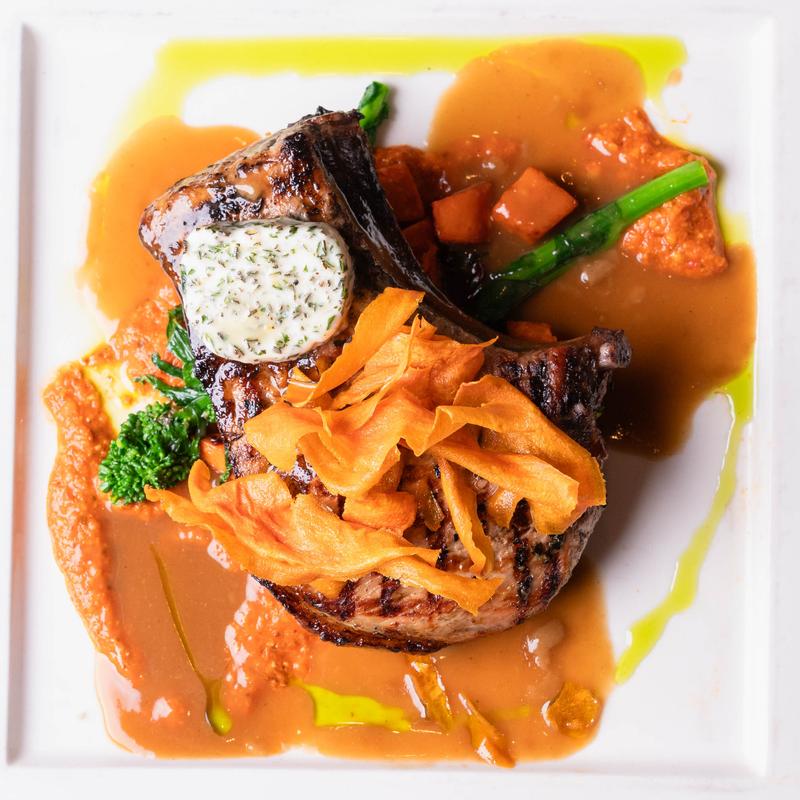 Miso glazed sweet potato, broccoli rabe, spicy serrano pork demi-glace.