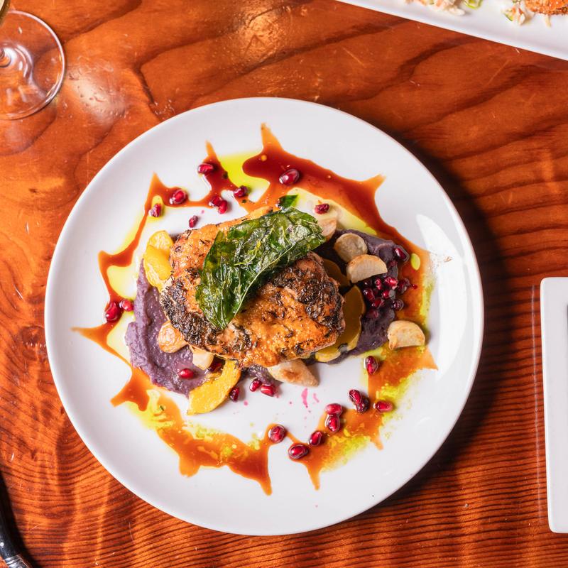 Mashed Okinawa purple potatoes, Tokyo turnips, delicata squash, heirloom carrots, pommegranate.